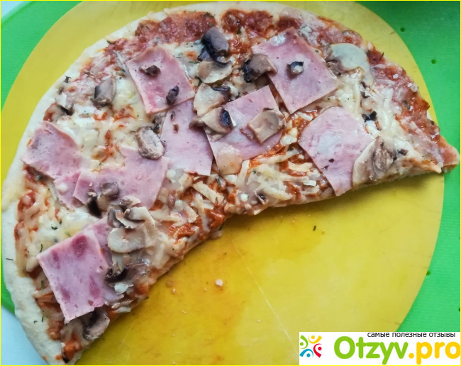 Перед едой я её разморозила в холодильнике, а уж потом разогревала. Вне сомнения на картинке эта выпечка изображена гораздо привлекательнее чем на самом деле! Но это и у других производителей также. Зато продуктов положили не пожалели. Большие и тонкие куски колбасы, грибы!