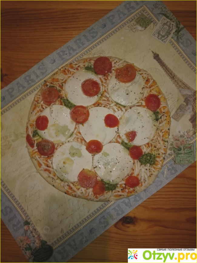 Помимо Моцареллы в начинке есть томаты, благодаря им пицца не сухая, а еще и базилик, получается ароматный вкус.