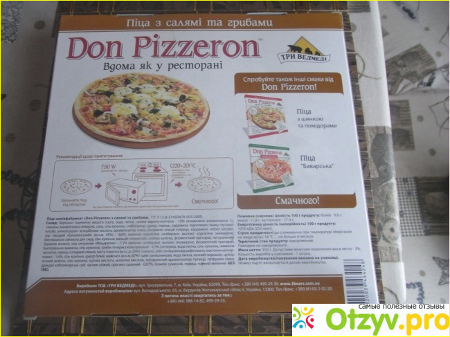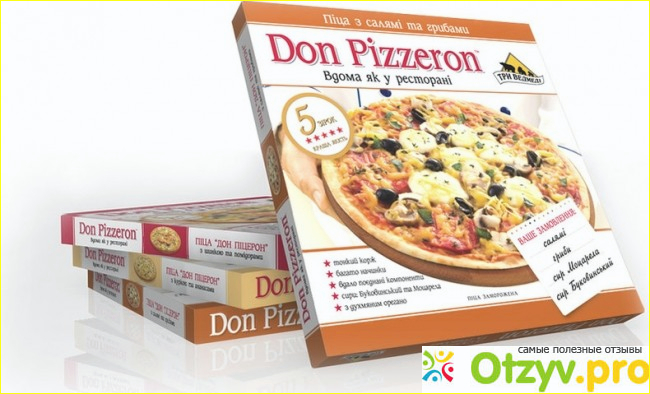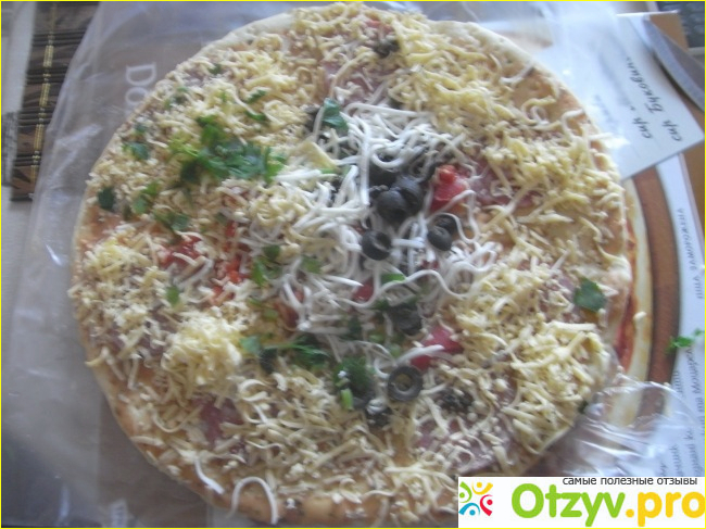 Плюсы : В пицце много начинки и картинка на коробке полностью соответствует пицце после приготовления , все ингредиенты в пицце свежие , в пицце идеально соблюдены пропорции в специях , пиццу очень легко готовить справится любой кто даже не умет готовить , коробка этой пиццы имеет привлекательный дизайн потому ее можно даже кому-то привезти в качестве подарка , это хоть и пицца для домашнего приготовления но подходит и для гостей .