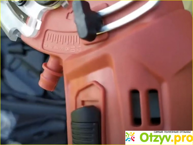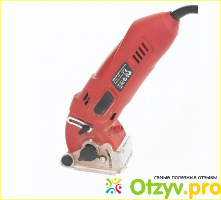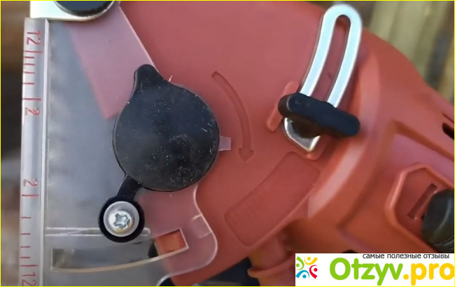 Устройство очень удобно лежит в руках и имеет множество полезных приспособлений и функций. Есть предохранительная блокировка с правой стороны устройства, регулировка глубины пропила, удобная рукоятка, труба для отвода пыли, а также специальные шкалы на основной плите, которые указывают глубину и длину.