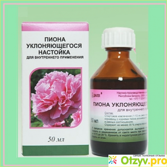 Настойка корней и корневищ пиона уклоняющегося обладает седативным, противосудорожным, антиоксидантным действием. Главным образом ее назначают при бессоннице и повышенной нервной возбудимости, вегето-сосудистых нарушениях взрослым пациентам, так как в ее составе присутствует 40%-ный этиловый спирт.