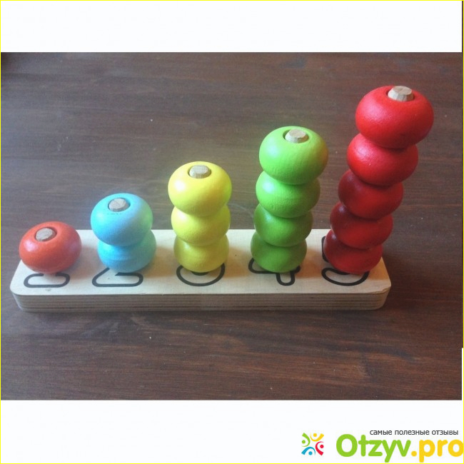 У этой пирамидки Счеты на деревянном основании прикреплены 5 палочек разной высоты, напечатаны цифры, которым соответствует число цветных шариков. Мы с этой игрушкой начинали учить счет. Диаметр отверстия немного больше диаметра самого штырька, поэтому шарик легко насаживается. Мы с такой проблемой столкнулись, когда купили на алиэкспрессе обычную китайскую деревянную пирамидку - кольца не налазили на палочку.