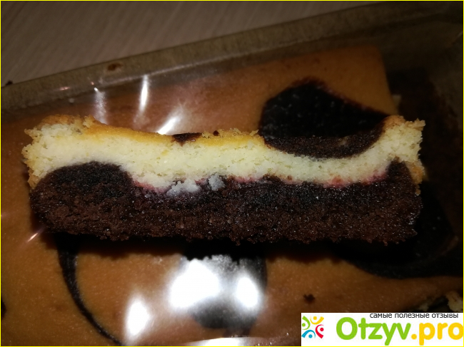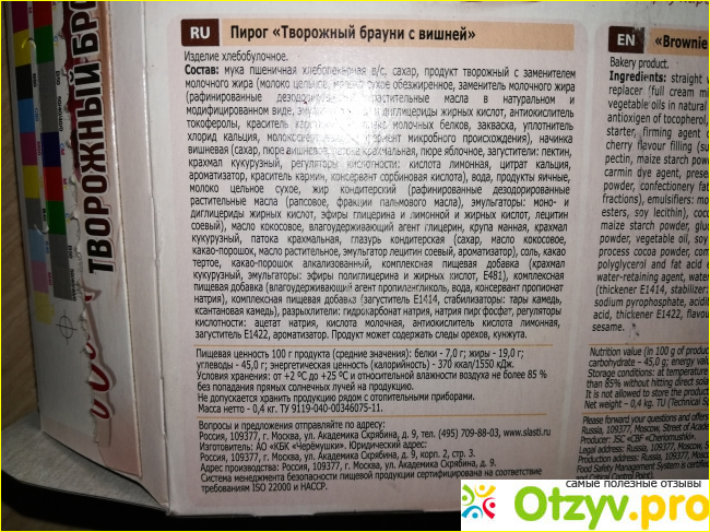 И вот за этот огромный список различных вредных добавок я снижаю оценку до 3, но при этом заявляю, что пирог Сдобная Особа Творожный брауни очень вкусный