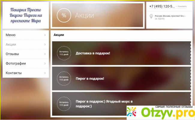 Сайт у них лаконичный и очень простой, но если вы очень голодный человек — заглядывать я туда не рекомендую! Изойдёте слюнями, пока будете рассматривать их кулинарный репертуар, настолько там всё красиво и аппетитно-привлекательно! Сам сайт состоит из центрального меню, где располагается вся продукция пекарни. Далее здесь можно узнать про различные акции, которые проводит предприятие. Далее есть страница с отзывами других людей, причём отзывы здесь натуральные! На любом другом сайте, компании сами пишут себе отзывы или проплачивают их конкретным людям. Здесь к этому подходят на совесть, оставляют как позитивные, так и негативные мнения, всегда отвечая на них по совести без утайки. А такое отношение к своим клиентам всегда вызывает доверие и доброжелательное отношение. В конце концов форс-мажорные обстоятельства бывают у любой организации, а не только у людей. Тут всё зависит от компании, как она реагирует на тот или иной свой косяк. Если честно признаёт и в последующем исправляет, возмещает деньгами или даёт скидку на свою продукцию, то это предприятие заслуживает уважения.