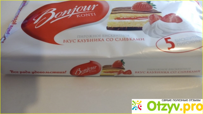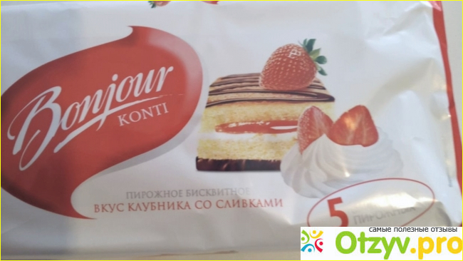 Бренд Bonjour мне уже давно знаком, но вот это Пирожное бисквитное вкус клубника со сливками купила сегодня впервые. Привлекла меня белого тона упаковка с аппетитным пирожным с красной клубничкой наверху, а еще рядом с ним сбитые сливки и тоже с клубникой. Да и цена, как принято говорить сейчас бюджетная 81 рубль 81 копейка по акции.