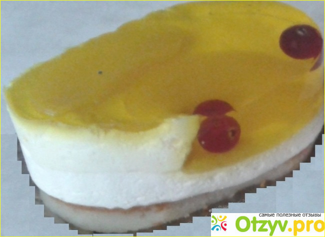Сразу бросается в глаза толстый слой из фруктового желе желтого цвета, которое по вкусу напоминает апельсиновый напиток. В этом желе, как в тайнике, хоть и прозрачном, находится два вида фруктов: ягодки клюквы и ломтики сладкой груши. Но груша - это вариация начинки, потому что там может быть и ананас, и киви, и клубничка, так что попробовать можно разные вкусы.