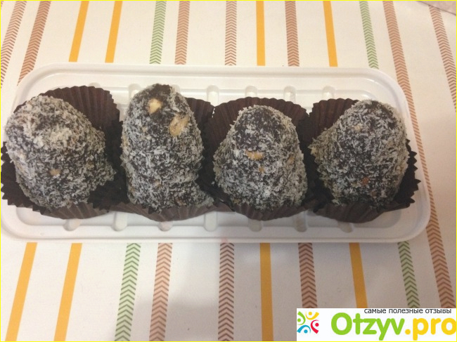 В коробочке четыре пирожных, разных по величине. Все правильно, близнецов среди плодов картофеля нет. Каждое пирожное присыпано кокосовой стружкой, весьма умеренно присыпано. Для меня это и к лучшему, не люблю ни чего кокосового.