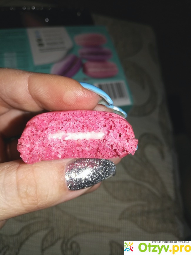 Вот только в отличие от песочного печенья, в макарунах используется бисквит средней мягкости.