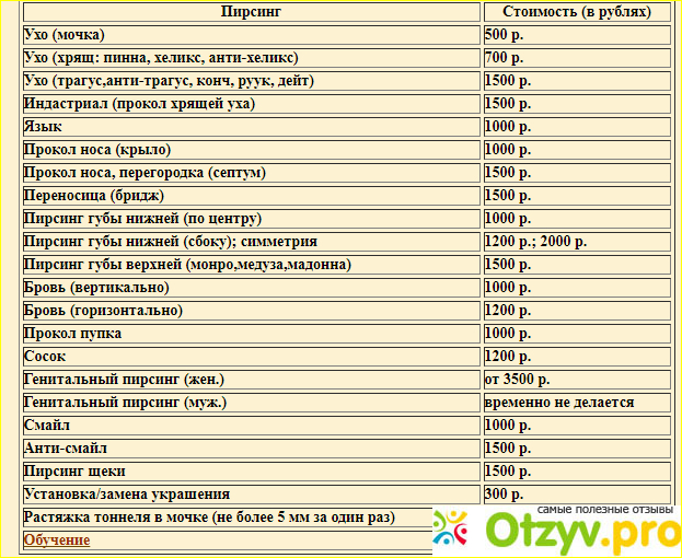 кстати, если говорить о том, насколько это дорого или дешево, то приведу вам пример вот этой таблицы, взяла ее на сайте одного из тату-салонов, которые занимаются пирсингом всех частей тела, как видите, расценки разные. Если говорить о том, что дешевле, то конечно, это мочка уха. Но, одним проколом Вы наверное не обойдетесь, а три прокола в ухо равноценны проколу хряща, что сегодня еще почему-то модно, хотя уже лет 10 этому виду. А вот прокол соска -1200 рублей, мало того, что это очень больно, еще и так дорого! Так же стоит прокол брови, мне кстати очень нравится этот вид пирсинга. но в случае, если брови будут просто идеальные, а это тоже дополнительный расход на специалиста, сами понимаете. В общем, красота требует не только жертв, но еще и крупной суммы денег. И это я привела таблицу расценок не самого дорого салона в Москве, есть конечно подороже. Единственное, что мне очень понравилось, на сайте описаны правила. Если гражданину меньше 18 лет, то он так просто не сделает себе пирсинг! А к пирсеру отдельные требования, причем книжка санитарная обязательная, слава Богу там о гигиене не просто говорят, но и соблюдают все правила.