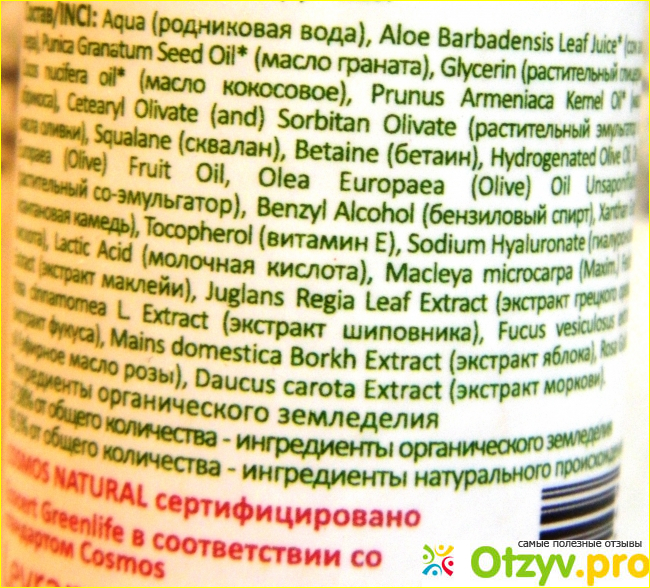 Коробка круглая, потому, видимо, трудно будет прочитать все, что входит в эти 15 мл. Я перечислю только главное - то, что приводится в самом начале (так как компоненты перечисляются в косметике по убывающей): вода родниковая, сок алоэ вера, масло граната, кокоса и абрикоса, растительный глицерин, эмульгатор из оливкового масла, бетаин. Так же содержится информация о том, что "27,38% от общего количества - ингредиенты органического земледелия, 99,5% от общего количества - ингредиенты натурального происхождения".