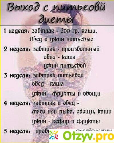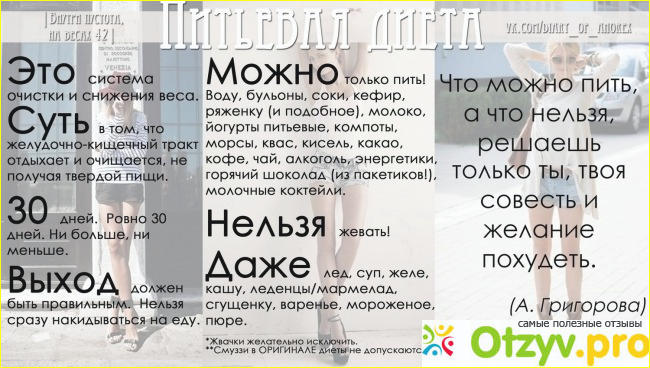 Питьевая диета не самая простая в плане соблюдения. Обычно она рассчитана на неделю и более по желанию. Эта диета уникальна тем, что запрещено употребление всех твердых продуктов. Придется есть только жидкую пищу. Разрешены: вода, свежевыжатые соки, молочные продукты низкой жирности, крем-супы из легких продуктов, кисель, чаи без сахара, компот, смузи, овощные, рыбные или мясные бульоны.