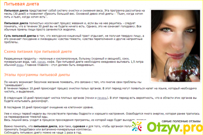 Эту диету можно использовать как мощное очищение, раз в определенный период времени. Она позволяет избавиться от шлаков и токсинов, исчезнут имеющиеся проблемы с кожей, возможно и аллергические реакции, которые наблюдаются у тех, кто не щадя себя поедает фастфуд, сладкое и вредные продукты. Для первого раза оптимальным является срок диеты на протяжении семи дней. Минимум в день нужно выпивать два литра, качественной, очищенной питьевой воды.