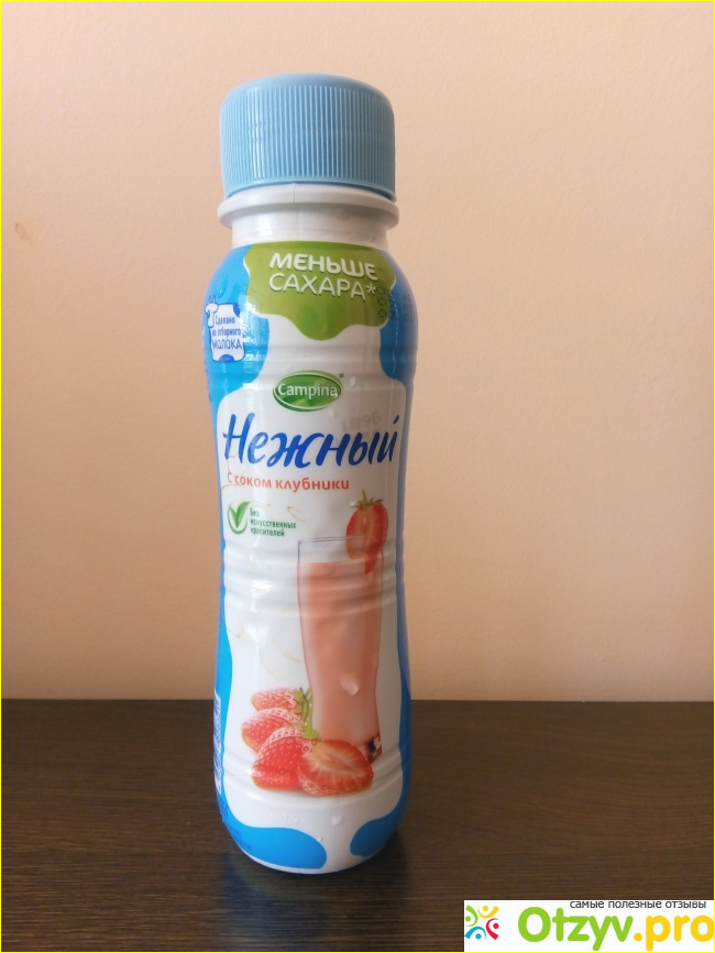 Они бывают различных вкусов и объемов, я беру обычно средний (285 гр), либо в стаканчиках. Любимый дочкин вкус клубничный. Массовая доля жира у этого напитка 0,1%. Сделан из обезжиренного молока. Без искусственных красителей. 50 ккал на 100 гр. Срок годности 6 месяцев. Чтоб столько храниться молочному продукту представляете сколько нужно добавить туда консервантов. Без них в составе не обошлось. А так бутылка яркая, приметная, с изображённой на ней аппетитной клубникой и стаканом с йогуртом розового цвета. Так и тянутся у детей рученки к этой бутылочки, когда видят ее на полках супермаркетов. Вкус у напитка действительно нежный, мне тоже нравится. Запах клубничный и цвет нежно-розовый. А вот на счёт полезности этого продукта сомневаюсь конечно. Хотя сегодня очень редко можно встретить по настоящему полезные продукты на полках магазинов. Поэтому решать вам, друзья. Мы иногда балуемся таким напитком.