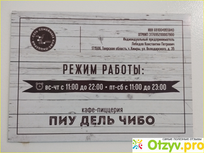 Посетили кафе- пиццерию Пиу Дель Чибо в Кимрах в мае 2023 г. У него хороший рейтинг на картах города. Сразу скажу, что заведение произвело неоднозначное впечатление.