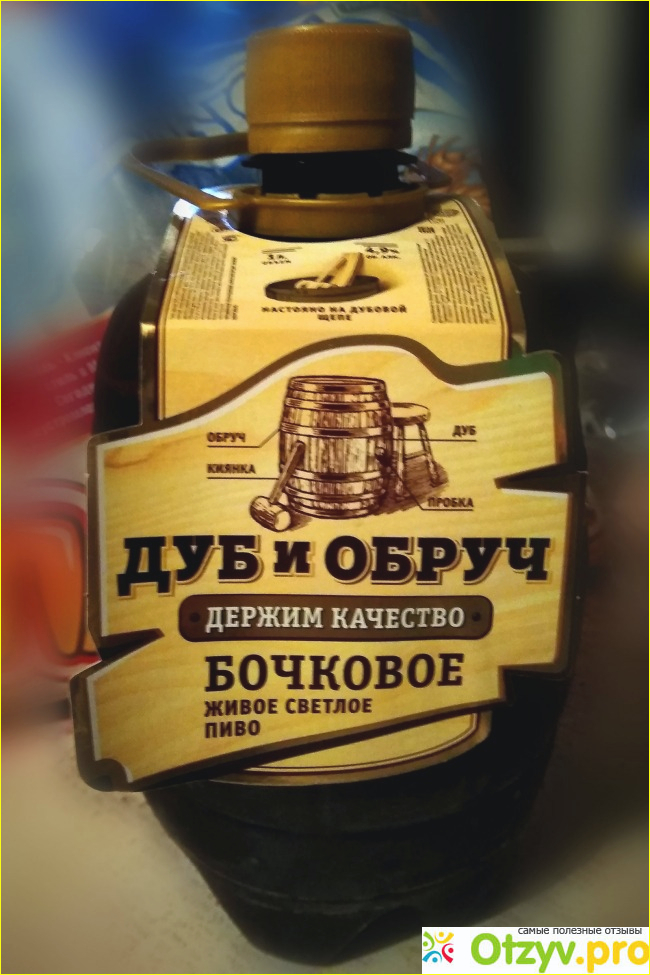 Бутылка пластиковая стилизирована под бочонок, то есть бочку. Выглядит внушительно, впечатляет. На что и купилась. На ней ничего не наклеено, а вся информация указана на этикетке, которая прикреплена к крышке. Но кажется эта бутылка такой маленькой, что 1,5-литровую мы изначально приняли за литровую, когда они стояли на прилавке. А что в этой литр – не поверили сразу. Нести его можно за ручку, что удобно.