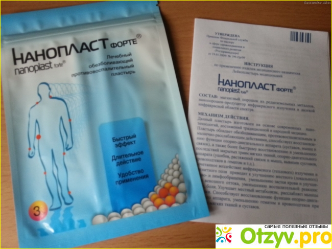 Пластырь «Нанопласт Форте» изготовлен по современной нанотехнологии с применением знаний и достижений в сфере народной медицины. Применение пластыря приводит к улучшению местного кровообращения, лимфообращения, уменьшает застой крови и эффективно улучшает отток лимфы, тем самым влияя на уменьшение воспалительных реакций, эффективно побеждая отеки и боли. Такой эффект достигается благодаря тепловому излучению, а также магнитному полю, создаваемому входящим в состав магнитным порошком.