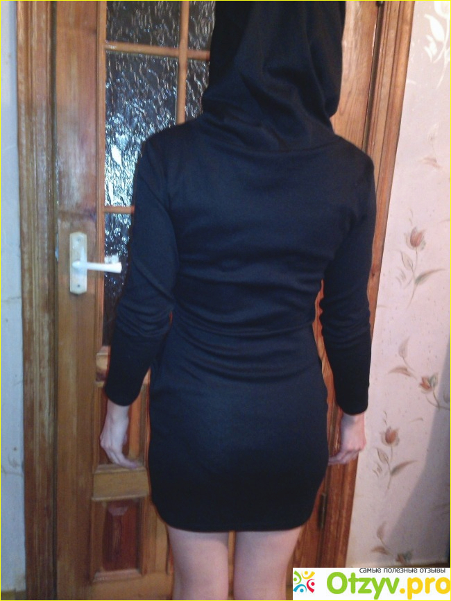 Собственно говоря, сзади оно выглядит так же практически. Высокая горловина - это воротник-хомутик. Он легко превращается в интересный капюшон. Вот к капюшону у меня претензий нет никаких. Смотрится и правда очень достойно. Как хомутик тоже, в принципе, воротник выглядит неплохо, нужно только приноровиться и выкладывать его аккуратно. Под шубку носить платье удобно, так как воротник я быстро подворачиваю вместо шарфика, экономя при этом время (в декретном отпуске, когда нужно совершать с дитятей прогулки, быстро одеться маме - это дополнительный бонус, да и вообще, каждая минутка на счету. Так что, по большему счёту, платье вполне комфортное.