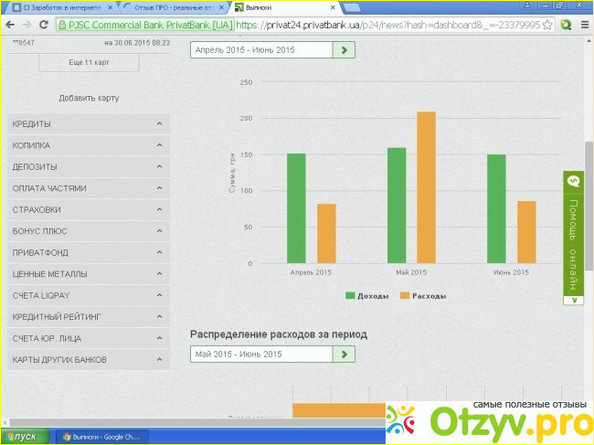 "ПРИВАТ 24" для меня настоящая находка, все можно контролировать не выходя их дома. Очень удобный сервер и абсолютно бесплатно. Всё Ваши расходы отображаются для вам на мониторе. Сервер доступен также с мобильного телефона. Если Вы в дороге, и нет возможности сесть за компьютер, все операции можно проделать без него, имея при себе мобильный телефон и 5-10 минут свободного времени.