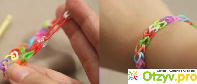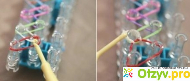 Рекомендуется начинать плетение с самых простых изделий, к примеру, браслет. Для того, чтобы браслет получился, очень важно, чтобы вы резиночки надевали правильно и в строгом порядке. Для этого необходимо надеть резиночку на два столбика - средний и боковой. Следующая резиночка надевается уже на боковой столбик и на средний, только второй по счету.