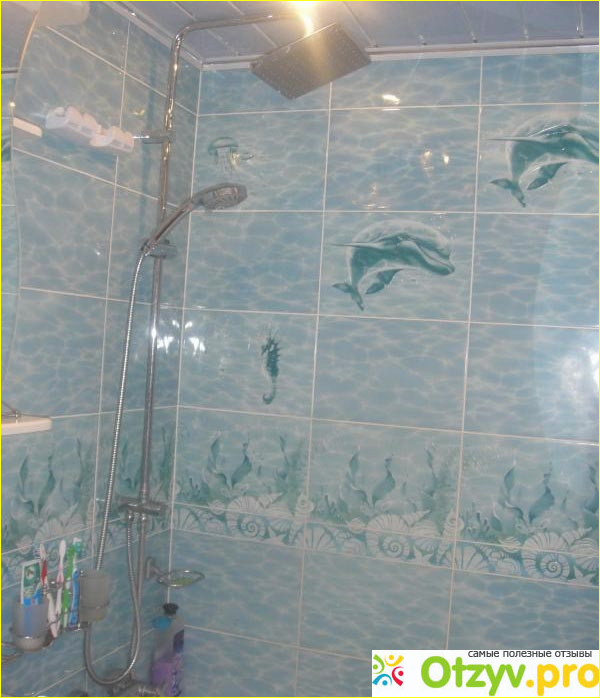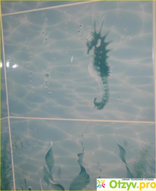 После окончания работ ванная совершенно преобразилась и стала выглядеть необычайно оригинально. Важно отметить что коллекция данной плитки имеет множество элементов декора. Например очень интересно смотрится панно с дельфинами, но размеры нашей ванной не позволили сделать этот интересный элемент. Таким образом мы обошлись двумя маленькими дельфинчиками, которые присутствовали на отдельных плитках. Тем не менее, это тоже смотрелось весьма оригинально. Также была одна интересная плитка с осьминогом и морским коньком, были также медузы и другие животные, которые нашли себе место в нашей ванне . Таким образом создался определенный эффект погружения в морские глубины. Разумеется ко всему необычному постепенно привыкаешь и начинаешь всё это не замечать, но пока уже прошло 2 месяца и всё равно всем нам находиться в ванной большое удовольствие. Таким образом эта плитка на мой взгляд довольно интересна и оригинальна, может дополнить интерьер любой ванной комнаты в зависимости от вашей фантазии.