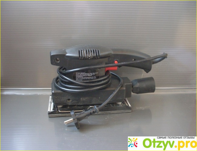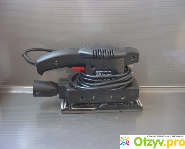 Ширина же подошвы 90 на 187 мм, как и качество исполнения зажимов для шкурки весьма неплохое. Показатель в пределах 11000 движений/мин. Я же себе приобрел эту замечательную вещь в Леруа Мерлен. Подкупило, не стану лукавить, хорошее качество сборки корпуса, низкая цена, поскольку не собираюсь использовать профессионально, ну и длина провода более метра.