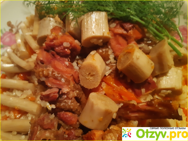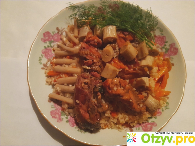 Берём большой чугунный сотейник и наливаем масло, ставим на самый высокий нагрев, как только масло станет очень горячим, жарим куриные бедра до румяной корочки. После этого жарим лук, нарезав кольцами, до появления румяного цвета. А теперь можно пожарить морковь, естественно, режем их соломками. Как только морковь станет мягким, наливаем воду. Пусть бульон для плова, будет кипеть, где-то 10 или 20 минут. После этого в бульон добавляем соль, специи и корни лопуха, чеснок. Ещё 10 минут даём кипеть бульону, только после этого, в бульон вкладываем рис, очищенный, вымытый. Рис перед добавлением должен постоять на тёплой воде, хотя бы 10 минут, после этого выливаем лишнюю воду и выкладываем рис в бульон. Нагрев ставим на средний уровень и закрываем крышку, оставляем плов тушиться где-то 30 минут, вот и готов самый полезный плов.
