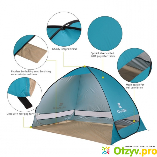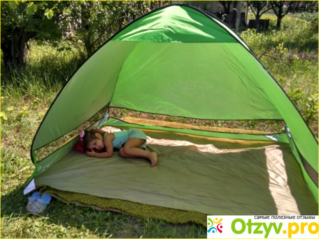 У палатки имеется пол. То есть вам не придется думать, что же еще взять с собой на пляж, чтобы подстелить покрывало или полотенце на песок или траву. Все уже есть в тенте! Практически невесома, то есть легкая, что упрощает ее транспортировку. Не обязательно для этого иметь автомобиль, чтобы перевозить ее. Ведь благодаря малому весу палатка очень удобна во время транспортировки.