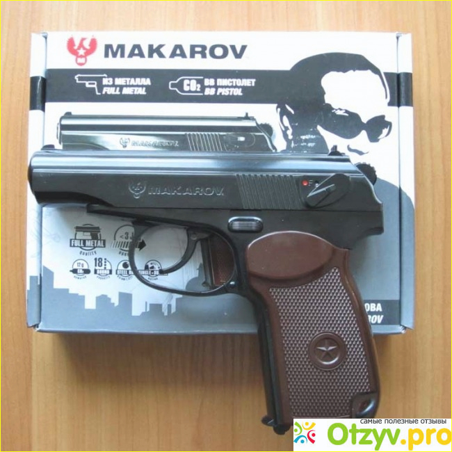 Немного хуже немец "Makarov Umarex". Корпус из облегченного металлического сплава. Есть неточности в конструкции. Магазин на 8 шариков. Рукоять - пластик "под дерево".