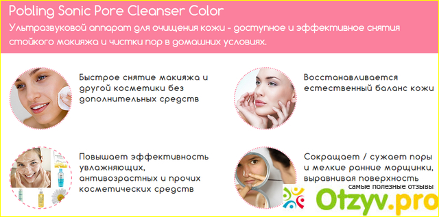 Аппарат не только прекрасно очищает кожу, он способствует полному исчезновению крупных пор, которые постоянно забиваются. Также в виду устранения воспалительных процессов, угри и красные прыщики тоже исчезают без следа. Если регулярно применять щеточку, то в скором времени даже по утрам кожа будет розовой и отдохнувшей. Используя аппарат можно существенно сэкономить на косметологе и навсегда избавиться от серого цвета, черных точек, мимических морщинок, а благодаря тому что ороговевшая кожа будет регулярно убираться, то бархатистость и шелковистость лица буде вам обеспечена. К тому же это здорового экономит время, на снятие макияжа и нанесение питательных средств уходит куда меньше времени, чем на отдельно взятые процедуры без подручных средств. Итак аппарат помогает: