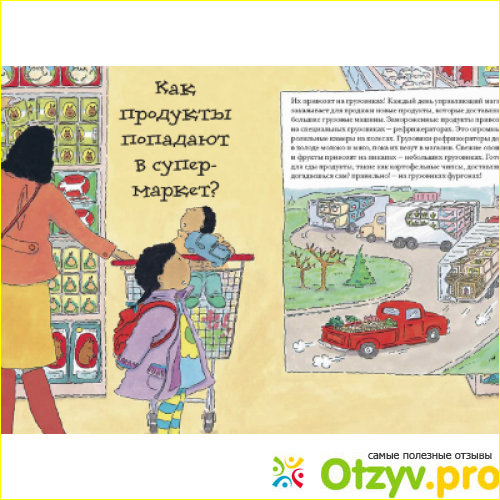 192 страницы замечательного и полезного содержания дают ответы на все волнующие ребенка вопросы, например - что такое супермаркет и зачем туда нужно идти. Как туда попадают товары, вот пример из книги - мама с ребенком как раз в супермаркете и выбирают продукты:
