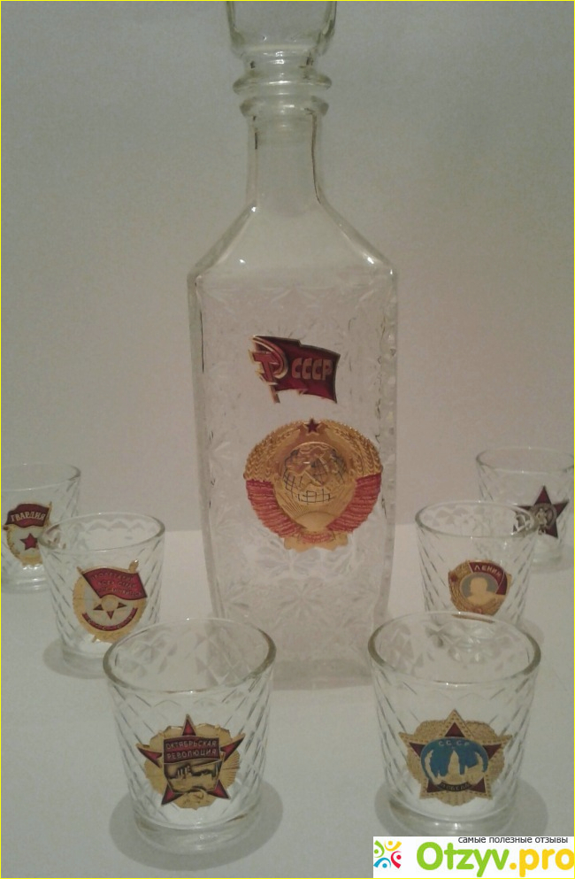 Если для женщин можно выбрать подарок относительно легко . Начиная с косметики и парфюмерии и заканчивая кухонными принадлежностями, мелкой бытовой техникой, а также полотенцами и постельным бельем. Полет фантазии здесь может быть безграничным. То с подарком для мужчин дела обстоят сложнее. Ну если только он не работает поваром или парикмахеров. Поэтому женщины и дарят своим мужчинам носки на 23 февраля или парфюмерные наборы на Новый год. А что если подарить мужчине набор для спиртных напитков, который не стыдно поставить на стол перед гостями. Тем более если он выполнен не в скучном стиле обычного графина, а в виде красивого штофа и шести стопок с надписью СССР и значками и медалями того времени. Это несомненно произведет впечатление на людей старшего поколения, погрузит их в воспоминания и ностальгию о временах Советского Союза. А дарителя этого, несомненно, удачного подарка, будут вспоминать всегда, когда на столе по праздникам будет появляться этот набор. Ещё один приятный факт, что изготавливают его в России, сделано всё очень качественно. Объем штофа 0,5 л. Материал-стекло.