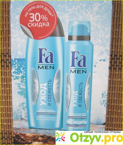 Рассказ мой будет о подарочном наборе для мужчин Fa Men "Уход и свежесть", включающий два средства личной гигиены: крем - гель для душа для тела, волос и лица, а также дезодорант в виде спрея.