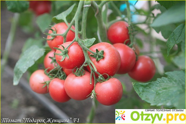 С одного куста можно собрать до тридцати плодов. Они имеют круглую, аккуратную форму. Максимальный вес одного такого помидора не превышает 250 гр. Проблемой сорта является то, что грозди иногда имеют большой вес и могут обламываться. Хотя кусты имеют довольно толстые побеги и много зеленой основной массы. Зрелый томат подарок женщине имеет равномерный красный окрас с розоватым оттенком. По вкусу умеренно сладкий. Не кислит. Сока не много, преобладает мякоть, семян также не много. Это прекрасный сорт и для салатов, и для сока с мякотью и для изготовления домашних засолок.