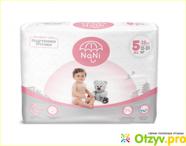 Нани хорошо пропускают воздух, попа дышит и не преет, нет эффекта парника. Высыпания и опрелости обошли стороной нас. Хочется еще отметить доступную адекватную цены и то, что делают их в России с применением современных японских технологий. В составе нет красителей и всего такого, они даже не пахнут ничем) По размерам выбор большой и на худеньких и на крепеньких малышей. Мы сейчас 15кг весим, так что беру размер 5xl, в самый раз, но все индивидуально, конечно.