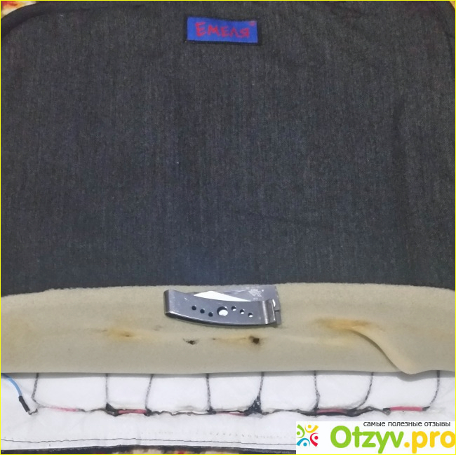 Вскрыл это чудо техники и обнаружил, что с одной стороны отвалилось углеволокно и медный провод насквозь прожег подстилку, на которой лежал нагревательный элемент. Ткань вроде не прогорела, но цвет ее явно изменился. С обратной стороны виднеются прилипшие остатки чехла. Лучше бы она сама сгорела к чертям, но нет же, до сих пор в рабочем состоянии и готова дальше делать свои "грязные" дела. Ладно бы простые чехлы "мадеинчина" были, а эти фирменные японские, под конкретную марку машины сейчас даже не купишь в России, досадно как то.