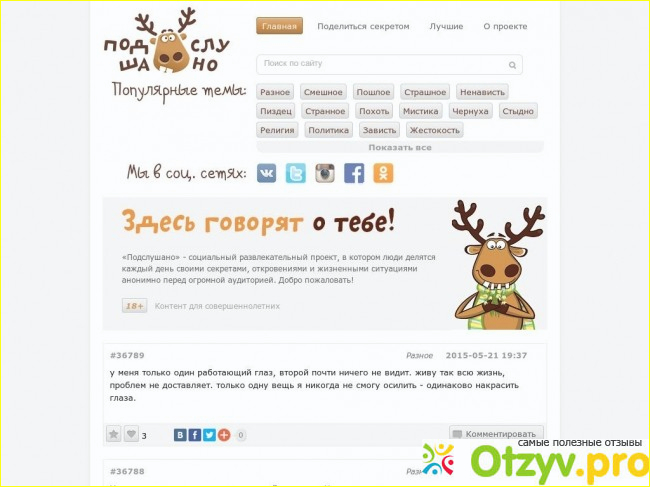 Ох, люблю этот сайт). Я услышала про «Подслушано» еще из соц. сети Вконтакте. Но мне местная аудитория не совсем нравится — дети читают эти истории, дети же их комментируют и, как мне кажется, многие из них также были написаны детьми, чтобы потроллить (уж слишком все безграмотно и глупо).