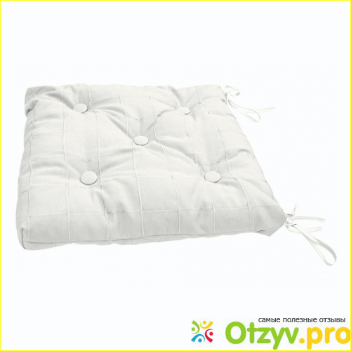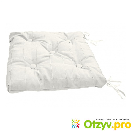 Рассматриваемая с вами подушка на стул имеет размеры 40 на 40 сантиметров, а также изготовлена из хлопка и полиэстера. Она имеет форму квадрата, потому подходит для большинства стульев. Пользоваться ею просто, ведь она имеет четыре веревочки, которыми она привязывается к ножкам стула, либо табурета.