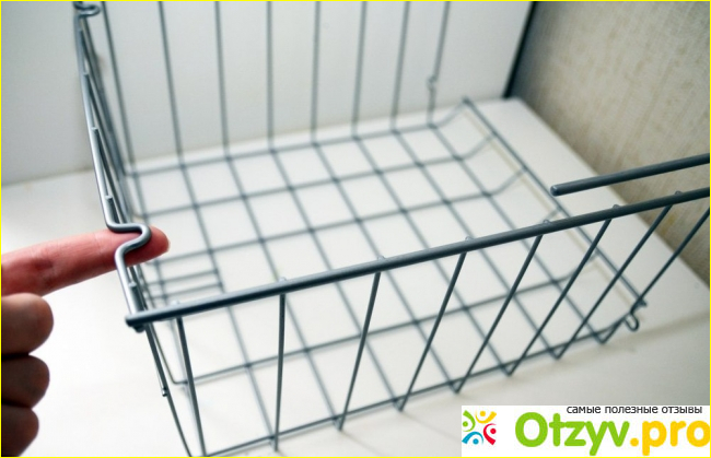 Корзинка снабжена двумя деталями из металла, которые играют роль держателей. За них корзина крепится на любую горизонтальную полку. В итоге под полкой образуется дополнительное место.