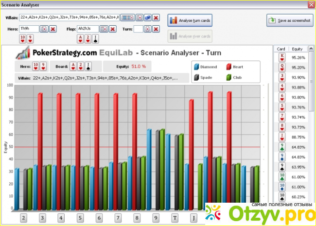 Работает калькулятор просто, выбираете нужные вам карты или диапазоны, нажимаете вычислить и программа показывает результат. В калькуляторе есть и анализатор сценария, он дает вам возможность подсчитать свое эквити на постфлопе.