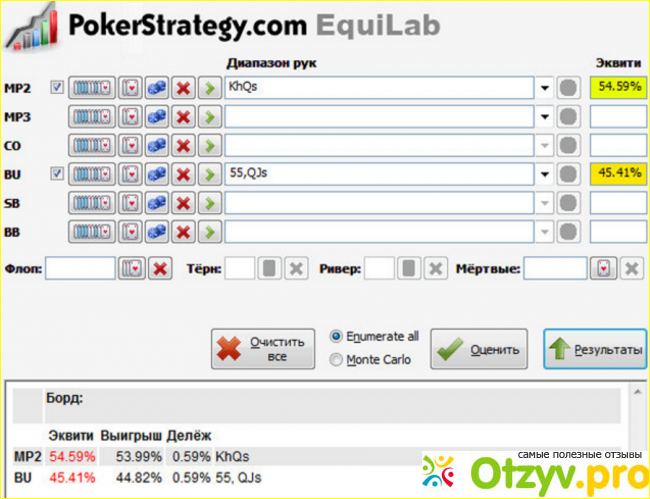 Если сравнивать с другими подобными программами то Equilab ничем им не уступает. Может быть меньше набор определенных возможностей программы, но отличия несущественные. И как я уже сказал программа бесплатная. Я использую Equilab давно и никаких проблем с данной программой не возникало. Сначала конечно было что то непонятно, но достаточно быстро я во всем разобрался. Чем больше вы будете работать с калькулятором, разбирать и анализировать раздачи, тем быстрее улучшите игру. Если вам будет что то непонятно и возникнут какие то вопросы вы можете зайти на сайт PokerStrategy.com и пообщаться на форуме на интересующую вас тему. На этом сайте вы найдете много полезной информации о покере.