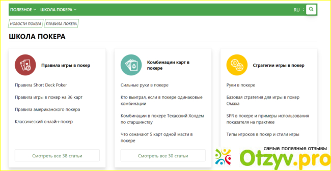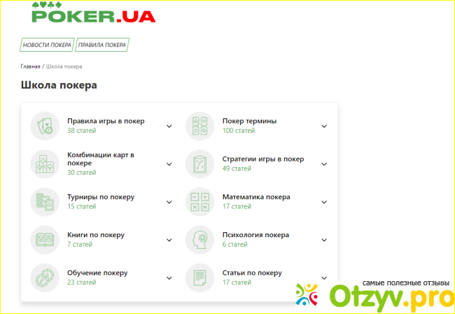 Мне понравилось, что на этом портале хорошо представлена информация в целом, а если конкретно, то каждая тема описана в отдельном разделе и это облегчило мое обучение. Еще с плюсов - нет рекламы, а это редкость в наше время. Нужную информацию можно найти в разделе Школа покера, там наглядно можно увидеть базовую программу обучения. После этого стоит практиковаться и результат - это, конечно же, индивидуально. Продолжаю посещать сайт для напоминания некоторых моментов.