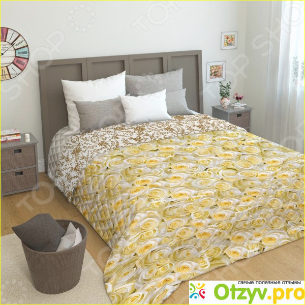 Покрывало двустороннее «Золотое искушение» - это дополнение, с которым стара кровать заиграет по-новому. Даже если у вас отсутствуют золотистые цвета в интерьере, есть возможность с помощью такого покрывала все исправить. Оно станет визуальным акцентом, придающим «изюминку» вашей спальне. Такое украшение полностью изменит представление о дизайне комнаты. С одной стороны вы увидите броские желтые цветы, с другой – более спокойные оттенки коричневого с абстрактным рисунком. Двухсторонний пошив привлекает тем, что время от времени вы без особых усилий сможете менять общий вид комнаты. Все под настроение.