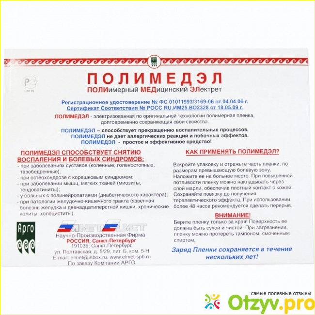 На погоду или после стресса заболит голова-похожу с пленкой и боль уходит, у мамы также, она анальгин почти не пьет теперь. Мы привязывали пленку на ногу когда отекала как у слона и через несколько часов отек спадал на этой ноге, а на другой оставался. Моя знакомая сделала операцию на глазах и глаза начинали сохнуть, краснеть, она прикладывала полимедэл и влажность в глазах приходила в норму, проходила краснота. У бабушки облегчалась боль в суставах, при застарелом бронхите начинала отходить мокрота. Конечно это не лекарство, но как ускоритель для убыстрения выздоровления очень подходит. Может она и не поможет если и сам человек себе не помогает и не меняет образа жизни, надо внимательно книгу прчитать-сказано, что каждому человеку нужно разное время для улучшения самочувствия.