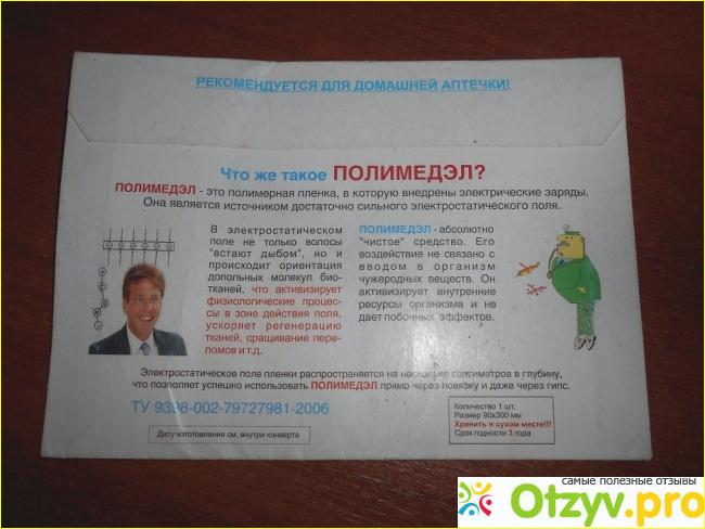 Когда-либо для исцеления все мы применяли физиотерапию. По сути, Полимедэл и оказывает подобное воздействие. Кто-то совсем не понимает, как он воздействует, считают, что все равно вылечит. К примеру, перелом. Пленка убыстряет срастание кости (если, конечно, нет недостатка кальция, фосфора, витамина D). А при дефиците этого не надо применять, пленка не поможет. А если ресурсы имеются, то и пленка придется кстати, ускорит выздоровление.