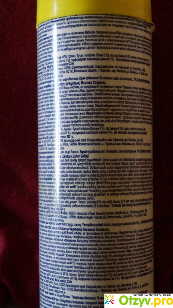 Теперь немного об аромате данного средства. Да, это химия, поэтому баллончик с данным средством лучше держать подальше от детей, да и подальше от открытого огня. Тем не менее, в его составе нет озоноразрушающих веществ, что обеспечивает безопасность его применения.