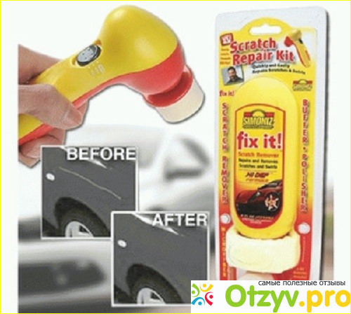 В комплекте идет специальный прибор для шлифовки. Это простая вещь наподобие ручного инструмента с вращающейся головкой. Работает она от батареек. На ручке есть кнопка. При нажатии на кнопку шлифовальная головка начинает крутиться. Всю машину муж таким прибором не обрабатывает – только проблемные места. Размер головки хорошо позволяет шлифовать царапины. Средство отлично втирается в поверхность и полностью заполняет дефект.