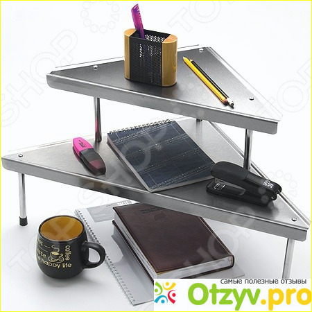 Большим, даже можно сказать огромным преимуществом этой полки является то, что она угловая. И как раз за счет этого самого момента и экономится рабочее место за столом. Так как чаще всего углы у нас остаются свободными или на них мы не можем положить слишком много разных вещей, а данная полка как раз позволяет сделать это.