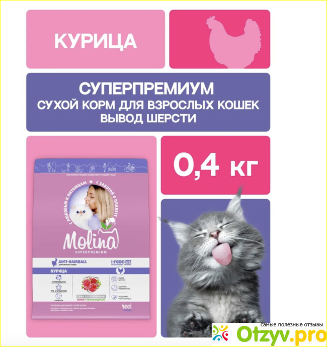 Но постоянно не будешь так кормить, животное ходит голодное. Тогда ветеринар предложил корм Molina. В нем низкое содержание калорий, достаточно белка. есть витамины, пребиотики для пищеварения. Еще фитокомплекс суперфудов, которые тоже дают полезные вещества. Для меня важно, что моя любимица всегда сытая, вес у нее стал намного меньше, как нужно для здоровья. А какая красивая сейчас шерсть, хоть сегодня на вставку. Корм с небольшими по размеру гранулами, это удобно для кошек.