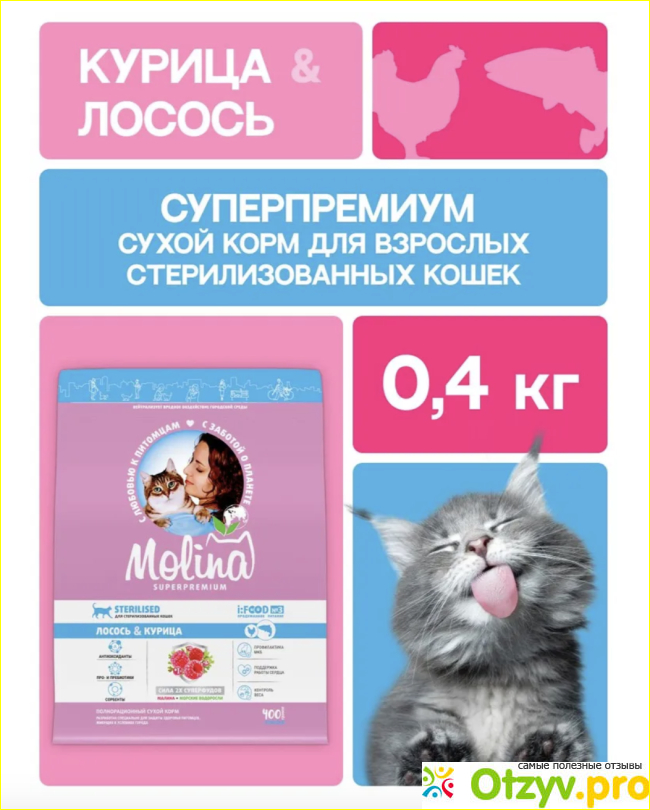 Дошло до того, что ветеринар муську на диету посадил. Но мне ее было жалко, потому что кошка была голодная. Я спросила в чате владельцев кошек, кто чем кормит. Так и узнала про корм Молина для стерилизованных кошек. Там грамотно подобранная калорийность, которая помогает кошке похудеть. Но она не голодная, потому что в корме много белка. А еще витамины, суперфуды. Это все помогает такому питомцу быть здоровым, не страдать от проблем с пищеварением, иметь здоровую кожу и красивую, лоснящуюся шерсть.