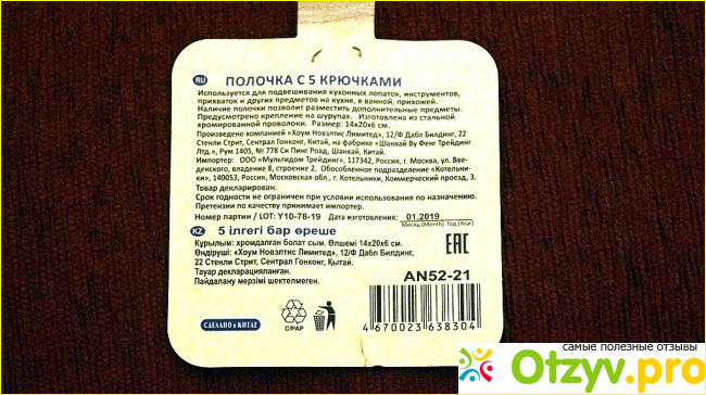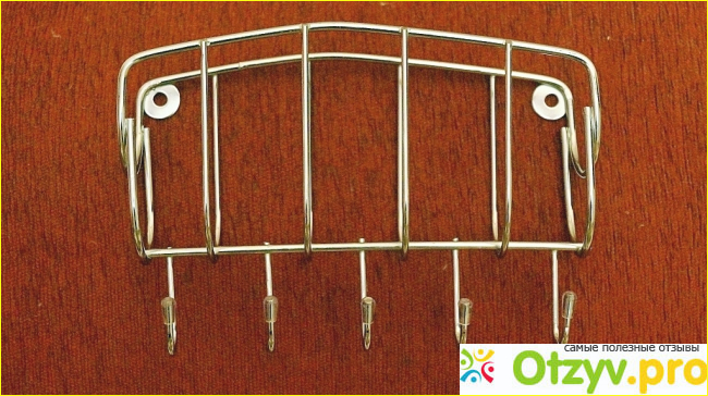 Что касается конструкции данной вешалки, то она довольно интересная, и представляет собой глубокую полочку с ограничителями из хромированной проволоки со всех сторон. К этой полочке в нижней части крепятся пять крючков. Крючки довольно большие и крепко закреплены к полке при помощи сварки. На крючки можно повесить полотенце, кухонную утварь, предметы одежды и другие мелочи. А на полочку можно положить какие-нибудь баночки со специями, кухонные принадлежности, моющие средства и т. д.